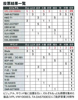 | 「批評家賞」が選出されるまで 「批評家賞」は、VGP(ビジュアルグランプリ)の一部門。本賞以外の賞が全て販売店票が加味されているのに対し、「批評家賞」は専任審査員8名の投票のみで選出される。各人がビジュアル、サウンド分野それぞれで優秀製品ベスト3を選ぶ。1位票は5点、2位票は3点、3位票は1点とし、合計得票数が最も多い製品が「批評家賞」受賞モデルとなる。 (審議日:2010年10月22日) 審査員 貝山知弘(審査委員長)、山之内正(副審査委員長)、岩井喬、大橋伸太郎、折原一也、鴻池賢三、林正儀、村瀬孝矢 |