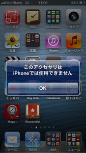 まずDigital AVアダプタを接続した時点で、「このアクセサリはiPhoneでは使用できません」というアラートが表示される。