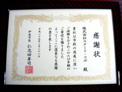この度の訪問では、伊達市からスタート・ラボに対し、同社が継続的に行ってきた復興支援活動に感謝状が贈られた。