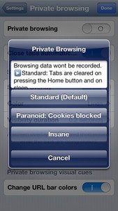 このアプリの凄いところは、プライベートブラウジング機能の圧倒的な充実ぶりです。何と、プライベートブラウジングに「Standard」「Paranoid」「Insane」の3モードが用意されているのです。ちなみにParanoidは「偏執病的」、Insaneは「正気じゃない」とか「狂ってる」といった意味なのですが、オススメはズバリ、Insaneモードです!