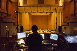 控え室に構築されたモニタリングシステムで会場の音チェックを行う鈴さんは、「非常にハイレゾリューションな耳を持っている人」と山崎さんが信頼を寄せているエンジニアだ。「今回はライブ録音なので、このホールで鳴っている音をそのまま感じられるようなサウンドを目指したい」という考えから、この場で良い音が録れるよう、マイクの立て方には気を配ったという。ボーカルやピアノ用マイクには高い周波数まで録れるものを採用。会場の空気感のカギになるオーディエンスマイクは多めに用意。ホール備え付けの天吊りマイクも使用した。この録音を後日テラミールスタジオに持ち帰り、ProToolsでミックス作業を行ったかたちだ。