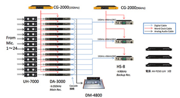 今回の録音は「DA-3000」を12台組み合わせた24トラック収録。フォーマットはPCM 192kHz/24bitで実施した。それぞれのレコーダーは、新製品となるマスタークロックジェネレーター「CG-2000」を使って同期をとり、コンソール「DM-4800」でミキシングされる。景井氏によると、最近ハイレゾ録音を希望するアーティストは増えているが、「DA-3000」を使ってこれだけの大規模なライブレコーディングを行うのは今回が初めてなのだという。録音機材のセットアップはTASCAMチームが行い、録音/マスタリングは、長年山崎まさよしさんとタッグを組んでいるエンジニア・鈴 悟さんが担当する。