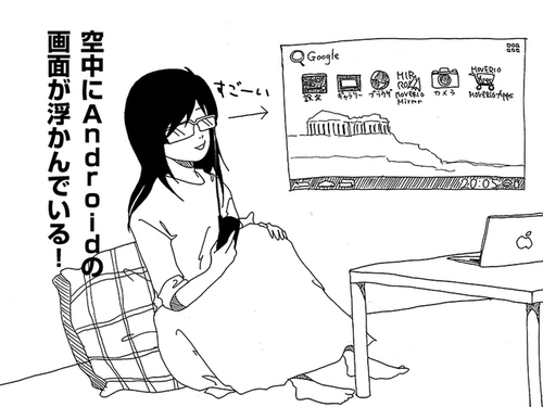 MOVERIOはシースルービューワーで、周囲が見えるので、いつも自分が過ごしている部屋の空中にAndroidの画面がフッと浮かんでいるような見え方になります。使っているうちに慣れてくるんですが、最初のうちはこの「日常の空間にAndroidの画面が現れる」という拡張体験が面白くて、ちょっと気持ちが盛り上がります。
