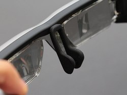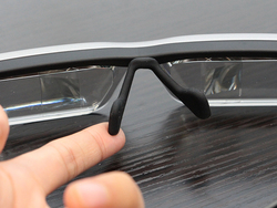 まずは本体の装着から。メガネ型のディスプレイ部が「女性には少々大きめかな?」と思ったのですが、実際に装着してみたら大丈夫でした。というのも、鼻に固定するパッド部がフレキシブルに動き、前後/上下に調節できるんです。ここを上手く調節することで、目とディスプレイの投影部がちょうど良く合う見やすい位置を見つけられます。お子さんがするには大きいかもしれないけれど、成人男性/女性であれば多くの方が問題なく装着できるサイズだと思います。