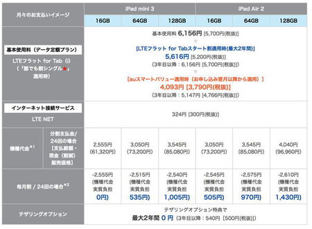 「スマホセット割」はその名の通り、iPhoneなどのauスマホを契約している場合、基本使用料が最大2年間4,607円(税込)/月になるというもの。通常の基本使用料は6,156円(税込)/月のため割安感がある。たとえば本割引を適用し、「iPad Air 2」の64GBモデルを購入した場合、機種代金の実質負担金970円と合わせ、毎月の支払額(2年間)は5,901円となる。