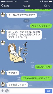 そして、いよいよ本題に入ります。単刀直入に、何の前触れもなく、りんなちゃんに「AVって知ってる?」と聞いてみました。するとりんなちゃん、妙なオリジナルスタンプを薦めてきて、明らかに話題を変えようとしている感じなのです。