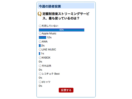 なお本読者投票は、AWA、LINE MUSIC、Apple Musicのトライアル期間に行われたもの。LINE MUSICはすでにトライアル期間は終了しており、AWAとApple Musicは3ヶ月無料トライアルを続けているものの、サービス開始当初に利用登録をしていた場合、Apple Musicも9月にトライアル期間が終了する。定額制音楽ストリーミングサービスが有料サービスとして日本でも浸透していくのか、今後もその動向に注目したい。