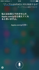 もうちょっと直球で聞いてみようと、「アップルは9月9日に何を発表するの」と聞くと、「私にはお答えできませんが、Apple.com/jpなら教えてくれると思いますよ。」と上手なかわし方。結局Siriからは何のヒントも得られなかった。