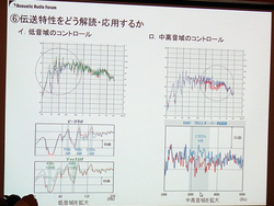 そしてデモを通じて「オーディオ機器における電気的な領域ではフラットにするのがいいのだろうが、アコースティックな、三次元的な現場ではあまりやらないほうがいいのではないか」とコメント。“特性をフラットにする”ことにこだわり過ぎるのではなく、伝送特性データの持つ意味や特徴を理解し、そのデータを部屋づくりに活かしていくという考え方を改めて紹介してイベントを締めくくった。