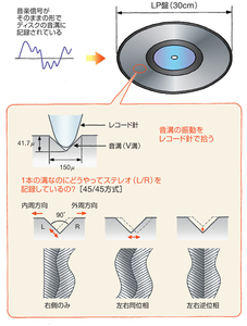 山之内「音の溝は左右45度に傾いていて、頂点が90度の直角二等辺三角形みたいになっています。そこに針が落ちると、左右の面に刻まれた波を針が読み取り、それぞれ左チャンネルと右チャンネルの電気信号に変えるのです」