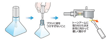 ひとつだけ注意すべきポイントがあります。それはブラシを動かす方向!「針元から先に向かって」そっと拭くようにすること。「必ずレコードの進行方向に沿って」と覚えましょう。逆なでは御法度、往復運動もイケマせんゾ!また湿式の場合は、完全に液が乾いてから再生するよう注意してください。針先が十分乾燥する前に再生すると、砥石のような作用をしてレコードを傷めることがあります。