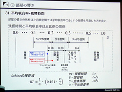 また、より直接的に「部屋の響き」を考える指標である「残響時間」については、音楽再生用途には残響時間は録音スタジオ等より長めであるほうが好ましいとされたり、低音域は中音域より長めのほうがいいとされていることなどを紹介。