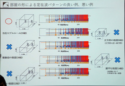 なぜ“部屋の形”が重要なのか。それは部屋の形によって定在波の分布形態が決まってしまうからだ。例えばブーミングなどは定在波の分布が偏ることが原因。部屋の形が悪いと、このようなオーディオ的な悪影響が出やすくなってしまい、しかもそれはルームチューニングアイテムなどでは根本的に解決できるものではないという。