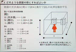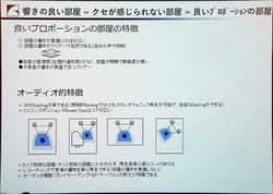そして、“部屋の形がいい”とはつまり“部屋の寸法比がいい”ということ。タテ・ヨコ・高さ(天井高)の寸法比によって、部屋の響きは大きく変わるのだ。寸法比のいい部屋では、低音の膨満感がなく音が明瞭であったり、中高音も響きが素直であったり、さらにリスニングのスイートスポットも広いなど、オーディオ的なメリットを多いのだと解説された。