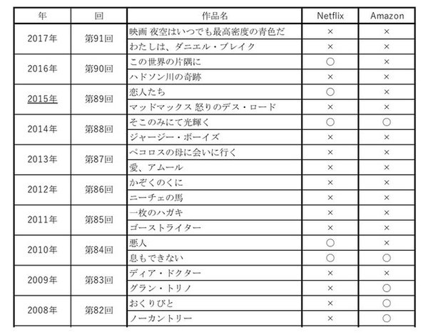 キネマ旬報ベストワン作品の、Netflix/Amazon Prime Videoの対応状況を一覧にまとめたのが以下の画像である(初めにこれを出せよ、という感じでしょうが、すいません)。