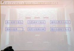 この日は3階建ての戸建ての3階部分にオーディオルームを構築した例などを紹介。前述のように重い材料を使ったほうが音質には有利なため、通常は1階に防音室を設けることが多いのだが、2階や3階でも同社は対応可能な点をアピールするなどした。