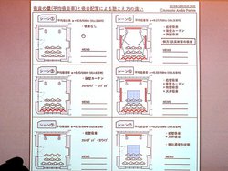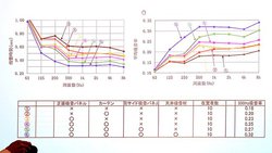ここでのひとつのポイントが、部屋に家具などを設置する前後それぞれの計測データが示されたこと。千葉県で施工したという31畳の広さを持つ防音シアタールームでは、家具なしでの空の状態での500Hzの平均吸音率が0.25をやや下回るくらいであったのに対し、家具を入れて人も5人入った状態では0.35をやや下回るくらいにまで変化。「荷物が入った段ボール箱がたくさん置かれた状態であったことも影響している。ダンボール箱は中低域を結構吸音する」などと説明された。