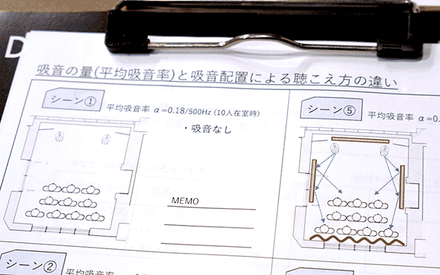 イベントでは、同社ショールームでの実験だけでなく、実際の物件での計測データも紹介。同社が設計した防音室の実例を基に、吸音についての解説も行われた。