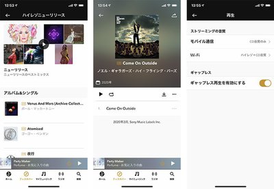 ハイレゾを強く意識したデザインを持つアプリ。ホーム画面はシンプルだが、レコメンド結果が反映され、「ディスカバー」「マイミュージック」「検索」などの基本メニューが使いやすい。各所に表示されるハイレゾロゴや、再生中の楽曲画面にもサンプリング周波数/ビット深度が表示され、オーディオファンの気持ちを高めてくれる。歌詞表示機能は持たないが、オフライン再生機能は搭載している。本サービスの大きな魅力は、PCソフトやスマホアプリの音質がよい事。最大配信レートこそ96kHz/24bitだが、iOSアプリはビットパーフェクトを実現しており、リアリティ、空間表現力、情報量ともNo.1で音質はトップクラス。大いに感激した。