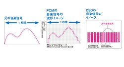 PCMは、【Pulse Code Modulation】の頭文字をとったもので、アナログの音楽信号を、サンプリング周波数と量子化ビット数の2つのサンプリングデータによってデジタル化する方式である。よく見かける●●kHz/●●bitという形式で表されるものはすべてPCMの音源である。たとえばCD音源は、44.1kHz/16bitと表現される。これは、1秒間に4万4100回サンプリングを行い、ダイナミックレンジ(音の大小)に関しては16bit=2の16乗=6万5536段階で表すというものだ。kHz/bitの数字が大きいほど、アナログ音源の波形に忠実にデジタル化できるため、音質面で有利とされている。