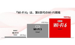 そのWi-Fiの最新規格が「Wi-Fi 6」。正式には「IEEE 802.11ax」と呼ばれる無線LANの通信仕様で、規格上の最大速度は9.6Gbps。2020年6月現在では、実効速度(スループット)はその半分程度の約4Gbpsですが、従来規格のWi-Fi 5(IEEE 802.11ac)と比べて高速です。