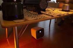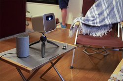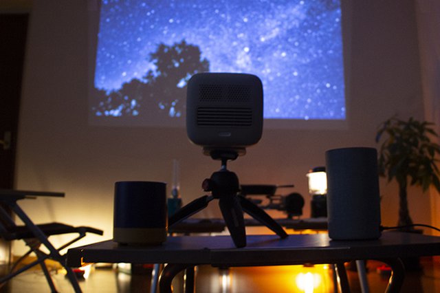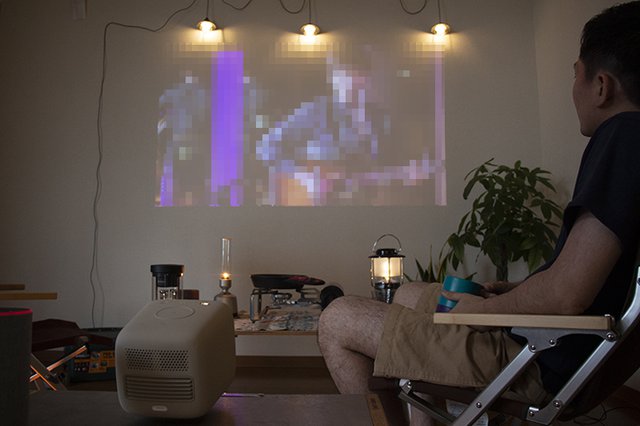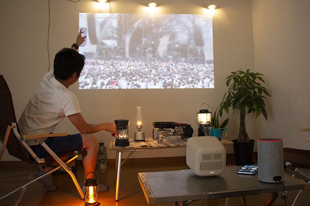 そこで用意したのは、BenQのモバイルプロジェクター「GS2」、ソニーのグラスサウンドスピーカー「LSPX-S2」とバルミューダのBluetoothスピーカー「バルミューダ ザ・スピーカー」、Amazon Alexa対応のスマートスピーカー「Echo」&「Echo dot」。具体的には、自前のスマートフォンとノートPCと連携して、プロジェクターで映像を、Bluetoothスピーカーで音楽や映像音を再生し、スマートスピーカーは周囲に配置して、川のせせらぎや虫の声などを流すことで、リアルな空間作りを目指している。