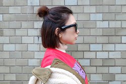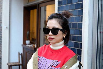 キャッツアイ風の大きめレンズが特徴のSopranoは、ハイグロスブラック仕上げが艶やかで、サングラス自体の印象も強い。加えて、若々しい雰囲気もあるように感じたので、強い印象に負けない派手カラーのトレーナーを合わせてみた。