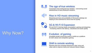 クアルコムのチャップマン氏は、Snapdragon Soundがローンチされる背景には、普及が勢いよく進む左右独立型完全ワイヤレスイヤホンを中心に、スマートフォンとワイヤレスオーディオ製品による体験向上をアピールする好機は今だからである、と説いている。
