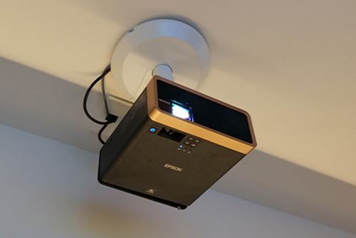 スクリーンもしくは壁に向けて大画面を投写するプロジェクターは、いずれもエプソン「EF-100」。枕元に設置されたHDMIもしくはUSB端子から、お手持ちのスマートフォンを接続して、映像や写真を大画面で楽しむことができます。