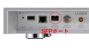 SFPとは、「Small Form Factor Pluggable」の頭文字を取ったもの。SFPポートは、オーディオ機器/ネットワーク機器に搭載される端子のひとつで、10mm×15mm程度の長方形の「穴」である。メーカーによって異なるが、「OPTICAL ETHERNET」あるいは「SFP」といった名称が付けられている。