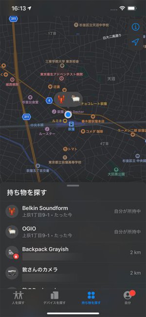 まずSOUNDFORM Freedomのペアリングが完了すると、アプリの画面下に並ぶ「持ち物を探す」タブの中にAirTagを付けたユーザーの所持品と一緒に名前が並ぶ。一方でユーザーのiPhoneやAirPods、Beatsのイヤホンなどアップル関連のデバイスは「デバイスを探す」タブの中にまとめられるところが異なっている。