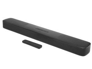 『閃光のハサウェイ』ディスクに収録されたアトモスサウンドを確認すべく、今回用意したサウンドバーはJBL「Bar 5.0 MultiBeam」。ワンボディタイプの機種なので、一人暮らしの限られたテレビまわりのスペースにも設置しやすい。また、「AMC(Automatic Multibeam Calibration)」という音場補正機能を備えており、簡単操作かつ短時間で、ユーザーの視聴環境にあわせて音響効果を最適化してくれるのだ。