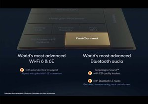 無線通信は動画・音楽のWi-Fi接続における大容量・低遅延伝送のパフォーマンス向上を押し進めた。セルラー以外の無線通信機能をサブシステム化した「Qualcomm FastConnect 6900」により、近年さらに普及が進むWi-Fi 6/11axのほか、拡張規格のWi-Fi 6Eを前世代のSoCと同様にサポート。最大3.6Gbpsの通信速度に対応する。