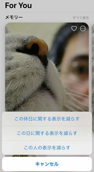 [写真]アプリの[For You]タブに表示されている各メモリーの右上に[…]マークがあるので、それをタップ。するとメニューが表示されるので、[候補への表示を減らす]をタップ。そこから設定を進めていきます。最終的に[この人の表示を減らす]か[この人を表示しない]を選ぶ画面になるので、どちらかを選んで[確認]をタップすれば完了です。