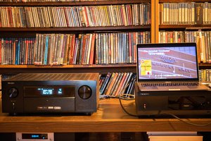 今回はωプレーヤーをインストールしたMacBookProとAVアンプ(デノン「AVC-X6700H」)をHDMIでつなぎ、9本のスピーカー(サブウーファーなしの5.4ch)で再生した。映像の解像度はフルHDで、ソニーの「VPL-VW1100ES」と120インチのスクリーンを組み合わせている。