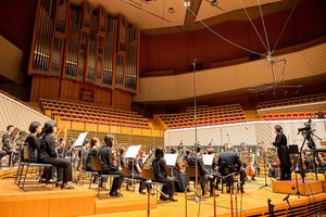 映像で見るステージは手前に弦楽器が並び、その奥に木管、金管、打楽器が並ぶ見慣れた楽器配置だが、通常のステージと同様、管楽器群はひな段を使っていて、弦楽器よりも高い位置に座っている。各奏者の姿がよく見えるのはもちろんだが、音響的な意味の方がより重要だ。ひな段に乗った方が音が客席に届きやすく、ハーモニーの純度も上がる。また、カメラの位置が指揮者に近いこともあり、木管や金管の外側に座っている奏者はほぼ真横から音が届くイメージだ。