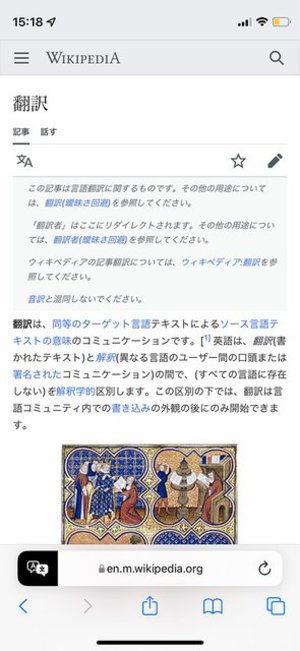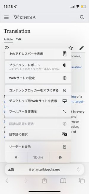 まずSafariでは日本語への「ページまるごと翻訳」ができるようになりました。ページのURLが表示されているバーの左端の[ぁあ]をタップすると、翻訳が可能な場合はメニュー内に[Webサイトを翻訳…]が表示されるので、それをタップ。