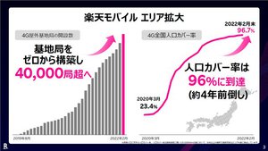 楽天モバイルは、2019年に携帯電話事業に参入した新しい携帯電話会社ですが、新技術を導入したネットワークを構築し、2021年には月額0円から利用できる料金プラン「Rakuten UN-LIMIT VI」を導入するなど、独自の施策で利用者を急速に伸ばしています。ゼロから整備を始めただけに懸念されていたエリアカバーに関しても、大幅な前倒しを進めたことで、2022年2月には4Gの人口カバー率が96.7%に達するなど、急拡大しているようです。