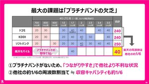 ただ矢澤氏によりますと、同社がプラチナバンドの割り当てを求める理由はエリアカバーだけではないとのことです。先にも触れた通り、楽天モバイルに割り当てられた周波数帯は他社より少ないので、一度に通信できる容量が少ないことも、プラチナバンドの割り当てを求める理由の1つになっているそうです。