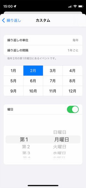繰り返しのカスタム設定は、毎日/毎週/毎月/毎年という基本の設定に付け加えるオプションです。例えば「毎週+カスタム」の設定なら、[繰り返し]設定のメニューから、