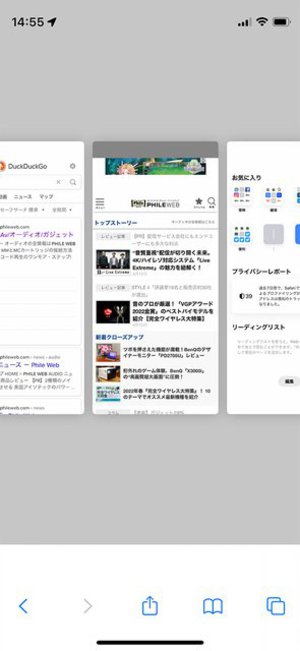 また「タブの一覧画面」を呼び出すのも、従来通りにタブアイコンをタップする方法に加えて、「タブバーを上にスワイプ」でも可能となっています。
