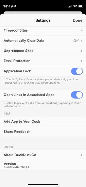 準備は簡単。AppStoreから「DuckDuckGo」をインストールしたら、[Settings]メニューで[Application Lock]をオンにするだけです。パスコードはiPhone全体のパスコードがそのまま利用されます。