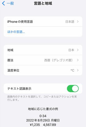 1)[設定]アプリの[一般]→[言語と地域]で[テキスト認識表示]をオンに