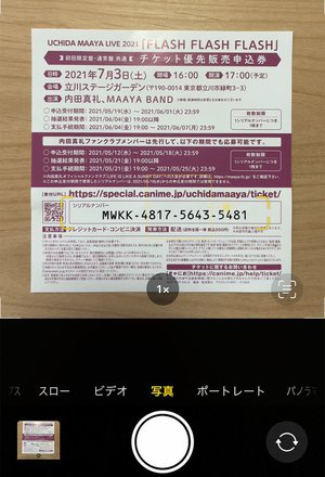 2)[カメラ]アプリでシリアルコードが記載されている応募案内を映し、シリアルコードのあたりをタップして「そのあたりに映ってるテキストを認識してね!」とiPhoneに教えてから、撮影範囲右下に表示されるテキスト認識アイコンをタップ