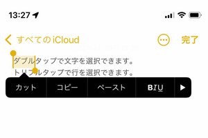 まずはダブルタップでの単語選択。例えば入力済みの「ダブルタップで文字を選択できます。」という文章があるとして、その「ダブル」のあたりをダブルタップすると「ダブル」が選択された状態になります。