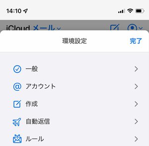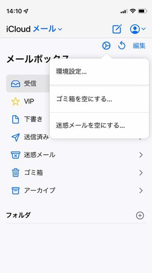 2)iCloud[メール]の[メールボックス]表示に移動し、歯車アイコンのメニューから[環境設定…]をタップ