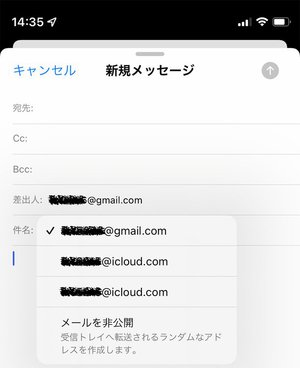 6)メール作成画面で[差出人]をタップして、エイリアスアドレスでの送信を選択
