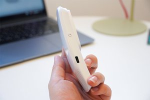 本体は約92gと軽量で、手のひらに収まるコンパクトサイズ。REON POCKET 2と変わらず、iPhoneなどのスマホよりも小さく、おおよそ二つ折りガラケーくらいの大きさといった感じで、第3世代になったものの外観上の変化はあまりない。