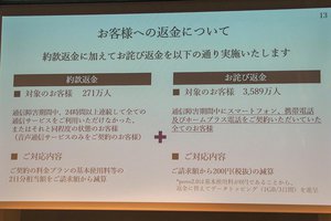 そして後者は、約款による返金対象の音声サービス契約者に加え、スマートフォンなどデータ通信にも対応したサービスの契約者も対象となり、その人数は3,589万に上る。今回の通信障害ではデータ通信には影響が及ばなかったので、データ通信対応プラン契約者は約款上返金対象にはならないのだが、障害の規模を鑑み、先の音声プランの日割り平均額となる52円に通信障害の影響が続いた3日をかけ、さらにお詫びの意味を込めて200円を返金するとのことだ。