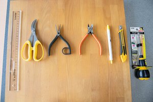 製作に入る前に、まず必要な道具を揃えましょう。ケーブルの長さを決めるための定規、そしてケーブルの被覆を剥くのに使う小型の園芸バサミです。カッターでも良いのですが、先が丸まっていて円周に沿って切りやすいので、これを使っています。さらに、ケーブルの中の充填材を切るためのニッパー。印をつけるためのマーカーも用意します。